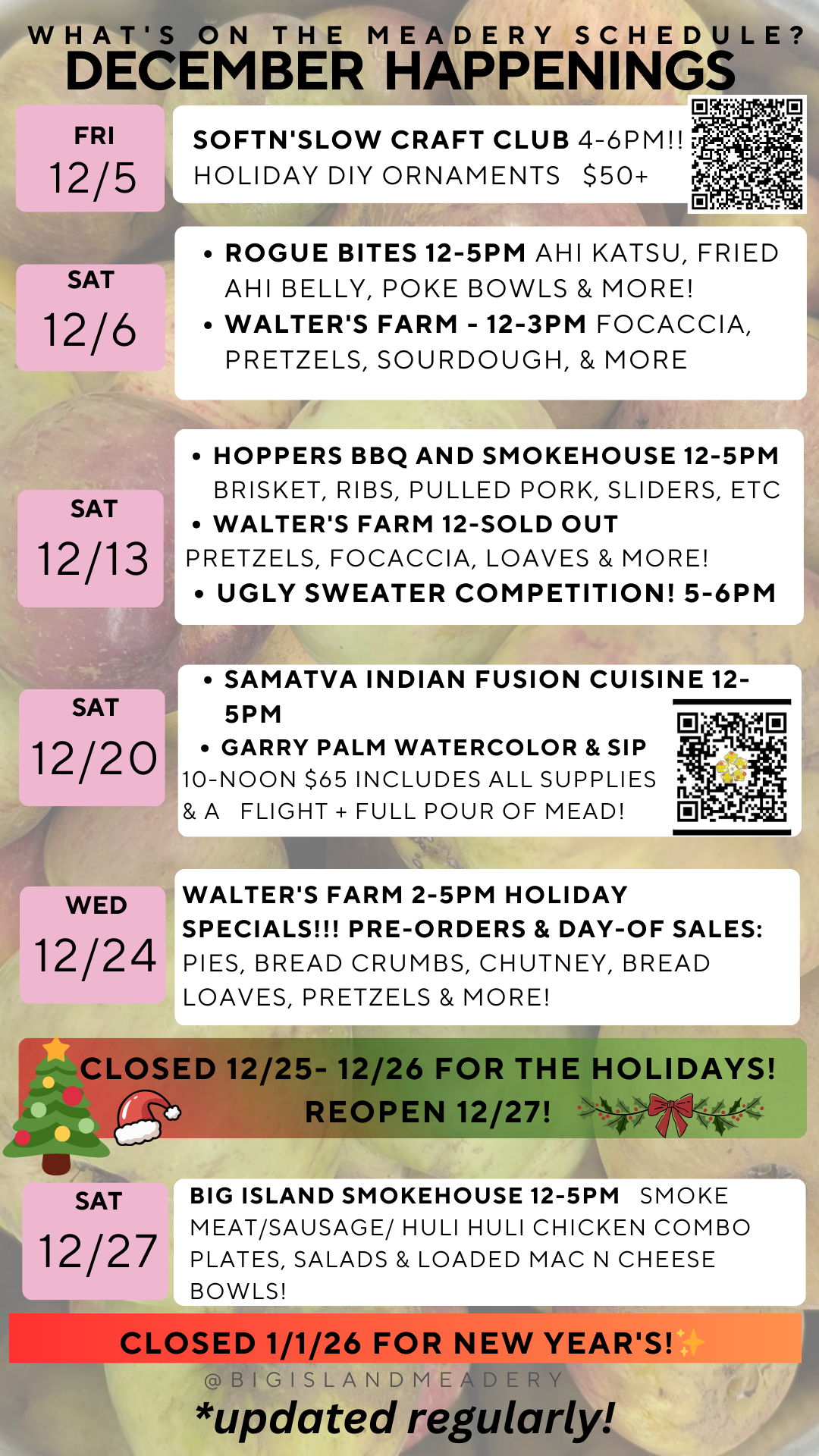 We have the above items on a daily basis with a rotating line up of awesome food trucks every Saturday! Peep the schedule below for that! 👇🏼